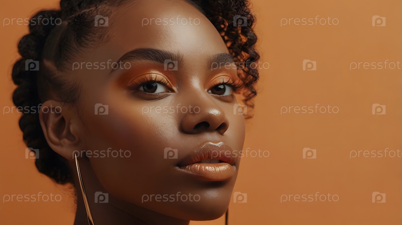 Красивый портрет чернокожей девушки на нейтрально-оранжевом фоне. Косметология, уход за кожей, уход за лицом и макияж