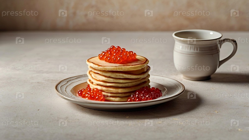 Русские традиции. Российский праздник Масленица. Натюрморт с кучей блинов и красной икры на светлом бежевом фоне