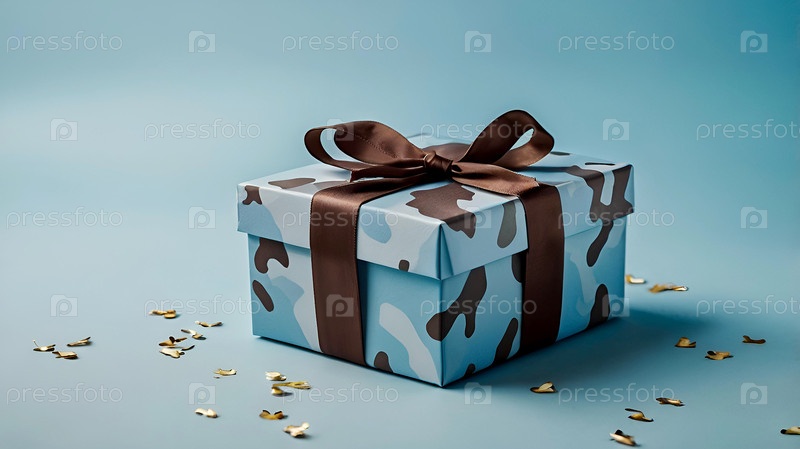 Концепция Дня защитника Отечества 23 февраля. Подарочная камуфляжная коробка с праздничным атласным ленточным луком на светло-синем фоне