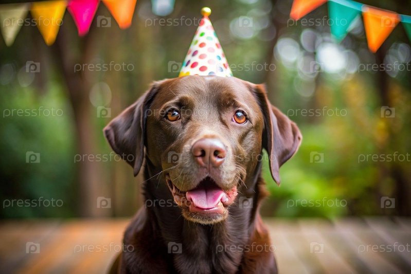 Коричневый шоколадный лабрадор празднует свой день рождения. Собака сидит с тортом, воздушными шарами и флагами на дне рождения питомца