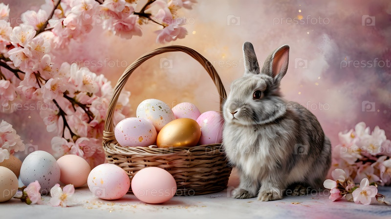 Концепция яркого пасхального праздника. Нежные пасхальные яйца в плетеной корзине, кролик и нежные розовые цветы на пастельно-водяном фоне