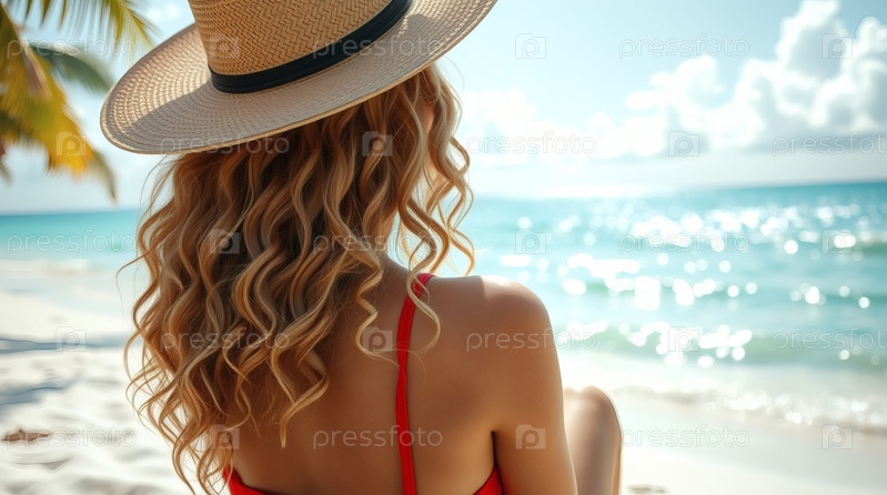 Женщина на отдыхе, сидящая в купальнике и широкополой соломенной шляпе на пляже в солнечный день и глядящая на море