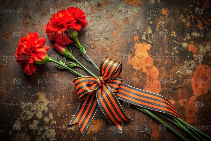 Баннер на 9 мая. Красные гвоздики и георгиевская лента на старом фоне. Концепция Дня Великой Победы 1941-1945 гг. и Дня защитника Отечества