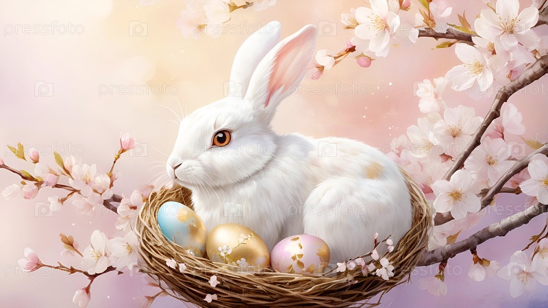 Концепция яркого пасхального праздника. Нежные пасхальные яйца, белый кролик и вишневые цветущие ветви на пастельном акварельном фоне с нежными прожилками