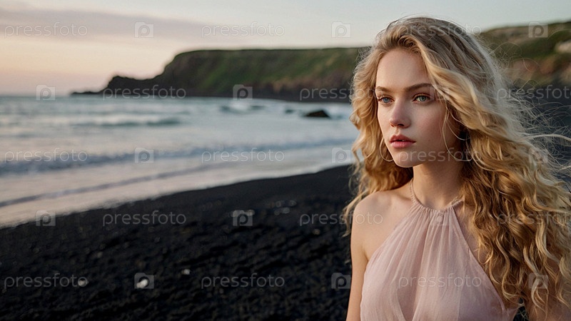 Портрет красивой женщины на пляже на фоне моря. Романтическая, спокойная и чувственная фотография девушки в воздушном нежном платье