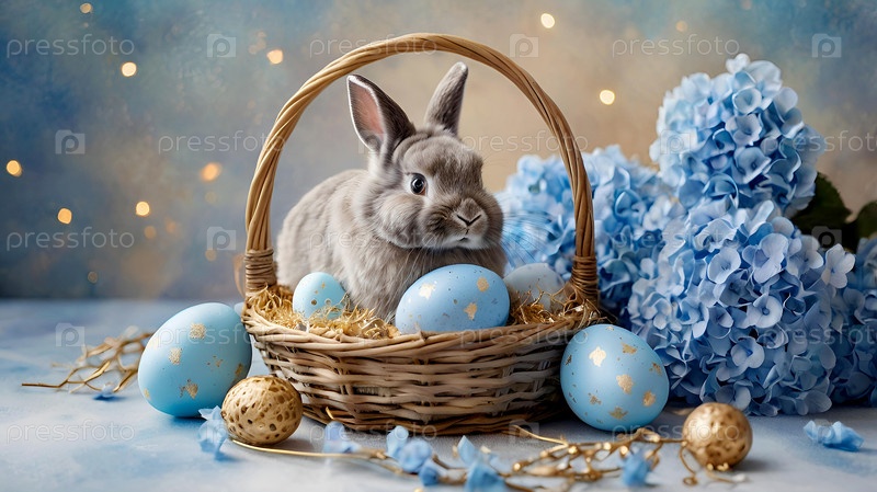 Концепция яркого пасхального праздника. Нежные пасхальные яйца, серый кролик и голубые цветы гортензии на пастельном акварельном фоне с нежными венами