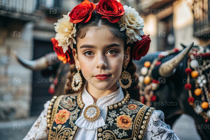 Испанская девушка в традиционном испанском национальном костюме. На фоне быка. Бой быков. Портрет символизирует традиции и культуру народа Испании