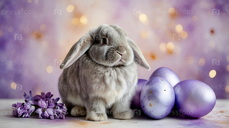 Концепция яркого пасхального праздника. Нежные пасхальные яйца, серый кролик и фиолетовые цветы гиацинта на пастельном акварельном фоне с нежными венами