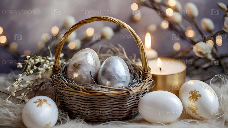 Концепция яркого пасхального праздника. Нежные пасхальные яйца в жемчужной корзине и нежные цветы на пастельно-водяном фоне