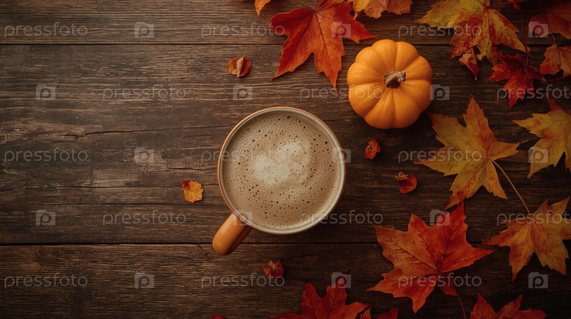 Вкусный тыквенный латте в кружке, тыквах и осенних листьях на деревянном столе. Сезонные напитки. Вкусный горячий капучино. Осенний баннер