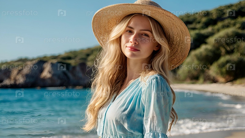 Летний отдых на пляже, крупный план красивой женщины в соломенной шляпе. Летнее время. Отдых и каникулы, место для копирования