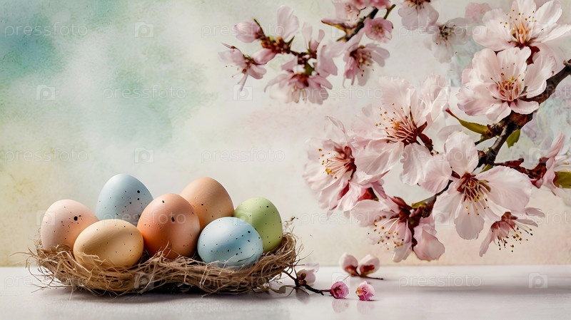 Концепция яркого пасхального праздника. Нежные пасхальные яйца и вишневые ветви цветут на пастельном акварельном фоне с нежными прожилками