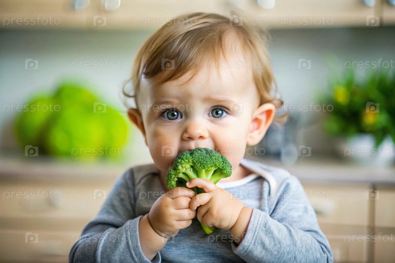 Здоровое детское питание. Первый прием пищи. Кормить ребенка. Симпатичный ребенок ест брокколи. Свежие овощи и фрукты
