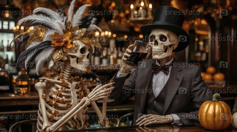 Пара любителей скелетов с коктейлями в баре. Вечеринка в честь Хэллоуина или Дня мертвых