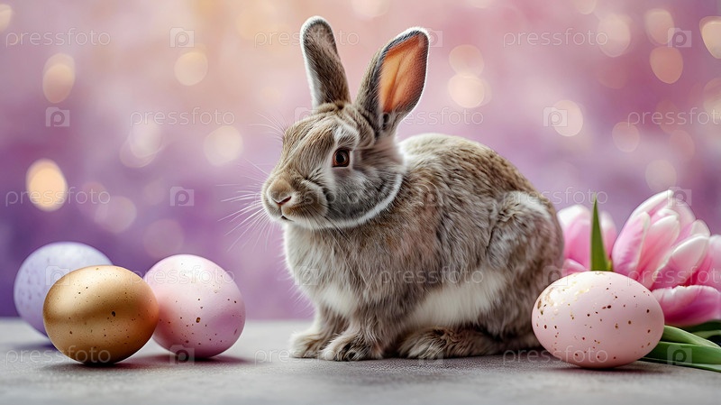 Концепция яркого пасхального праздника. Нежные пасхальные яйца, серый кролик и цветы тюльпанов на пастельном акварельном фоне с нежными венами