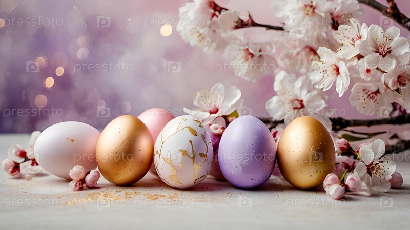 Концепция яркого пасхального праздника. Нежные пасхальные яйца и вишневые ветви цветут на пастельном акварельном фоне с нежными прожилками