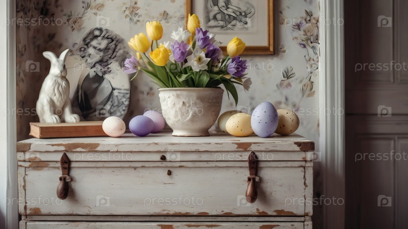 Концепция яркого пасхального праздника. Ретро интерьер дома с пасхальным декором. Весенние цветы в белой вазе и пасхальные яйца в пастельных оттенках