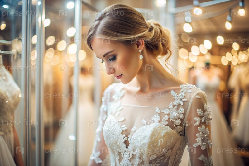 Аренда и покупка свадебных платьев для проведения мероприятий. Близко. Красивая девушка Невесна примеряет элегантное белое свадебное платье в роскошном свадебном салоне