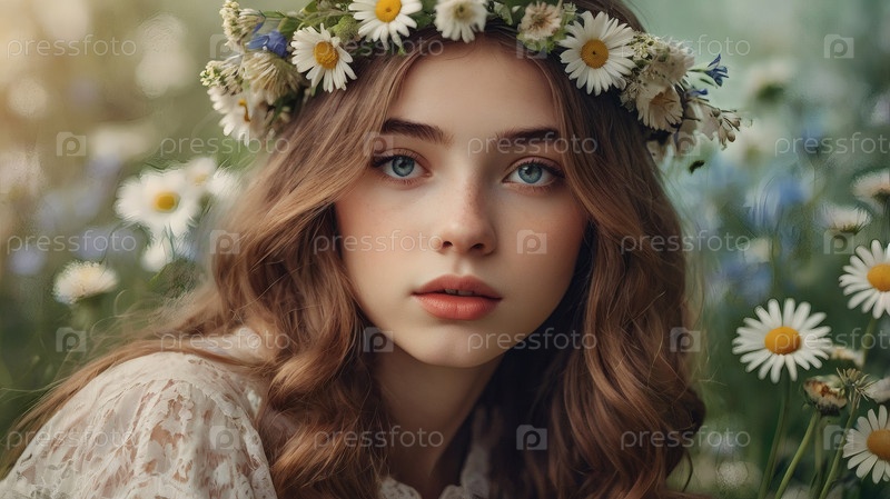 Красивая девушка с венком из ромашек и кукурузных цветов на голове в поле. День святых Петра и Февронии. Всероссийский день семьи, любви, верности