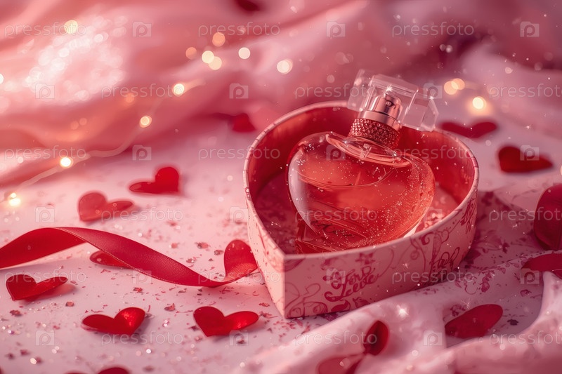 Парфюмерия и косметика. Элегантная бутылка женских духов в мягкой розовой подарочной коробке, украшенная красной лентой и сердцами. Подарок на День святого Валентина