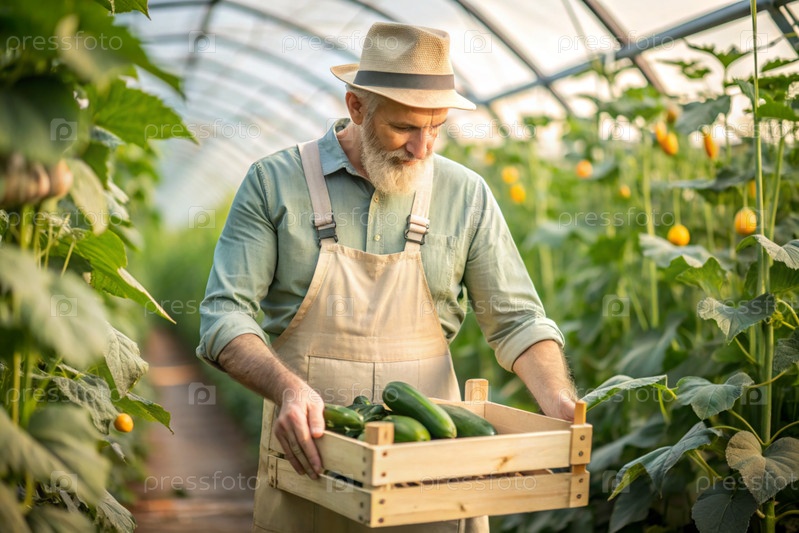 Сельскохозяйственная промышленность. Деревянный ящик с огурцами в руках фермера-мужчины. Садовник собирает богатый урожай в теплице
