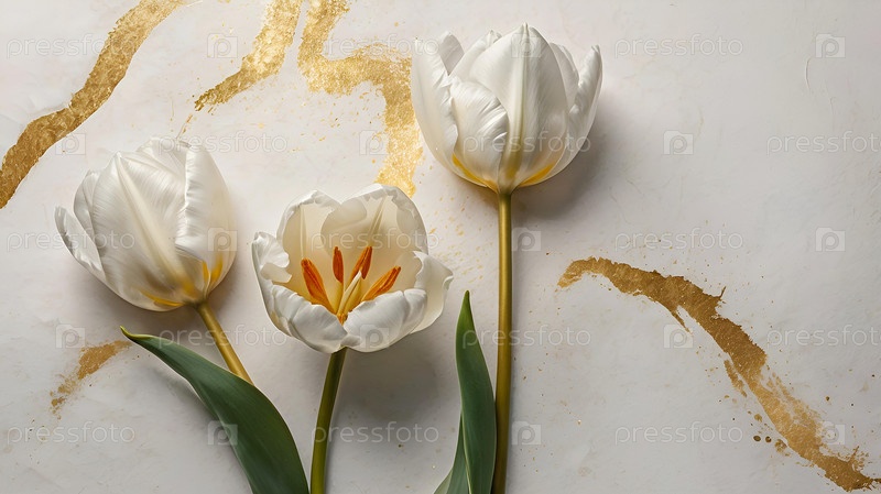Тюльпаны — весенние цветы. Красивый цветочный фон с красивым эффектом боке. Тюльпановые почки на белом акварельном фоне с золотыми жилками