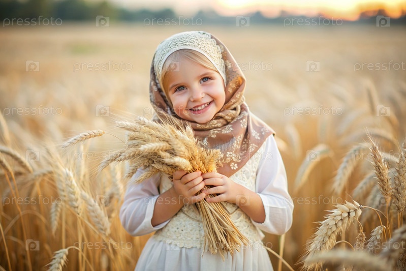 Русская русская девушка в белом платье и русской шали держит золотые уши пшеницы на фоне созревающего поля. Концепция посадки и сбора богатого урожая. Сельский пейзаж
