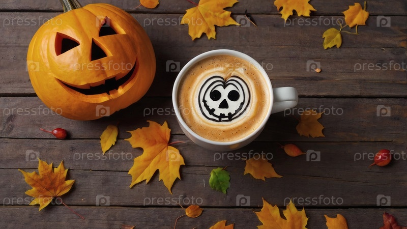 Праздники Хэллоуина. Тыква, осенние листья и чашечка кофе Хэллоуина на столе. Вид сверху, деревянная поверхность