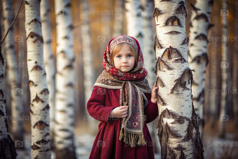 Русские народные традиции. Русский аромат. Симпатичная маленькая девочка в национальном русском платье и платке в красивой березовой роще. Портрет красивой девушки в березовом лесу