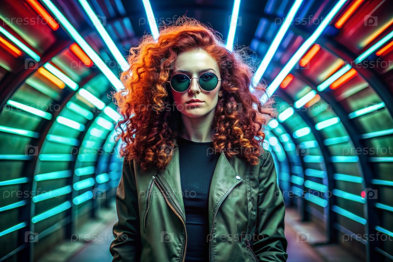 Молодая стильная красивая девушка в солнцезащитных очках стоит в неоновом туннеле на фоне неоновых вывесок