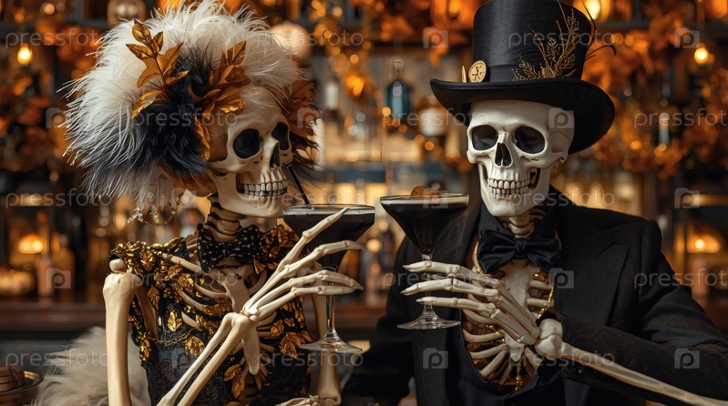 Пара любителей скелетов с коктейлями в баре. Вечеринка в честь Хэллоуина или Дня мертвых