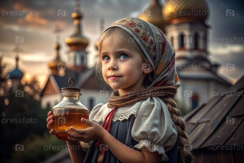 Концепция русского православного праздника Медовый Спаситель. Красивая маленькая девочка в русской национальной одежде и шарф с банкой меда на фоне православной церкви