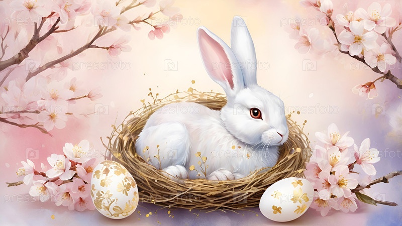 Концепция яркого пасхального праздника. Нежные пасхальные яйца, белый кролик и вишневые цветущие ветви на пастельном акварельном фоне с нежными прожилками