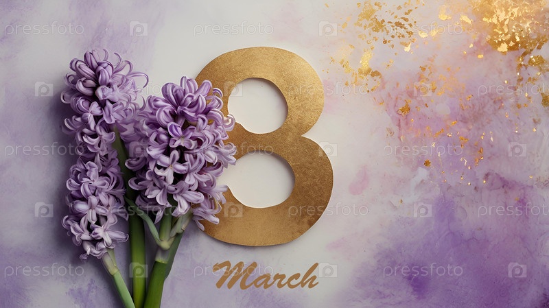Международный женский день. Праздник приходится на 8 марта. Баннер, флаер. Праздничный, нежный фиолетовый цветочный фон с номером 8