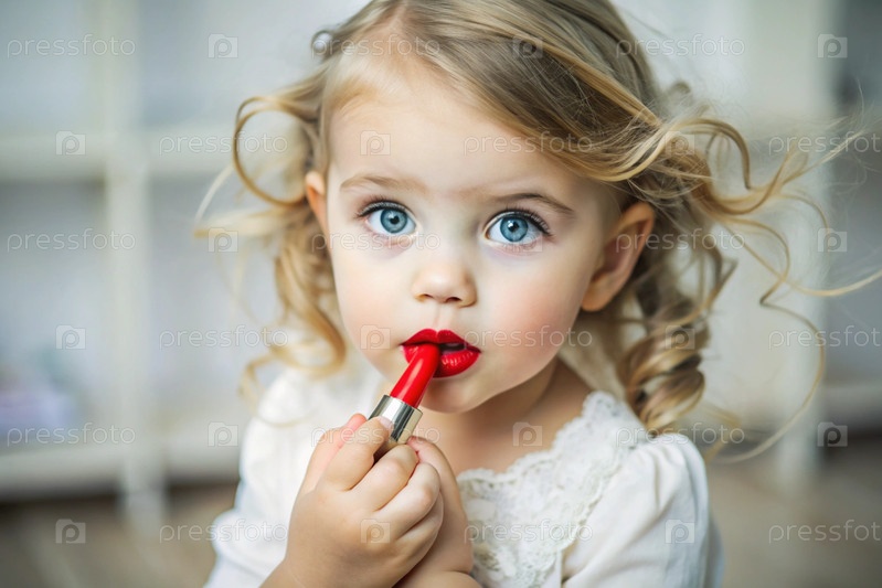 Симпатичная, забавная девочка в платье красит губы красной помадой, как мама. Девушка играет с женской косметикой