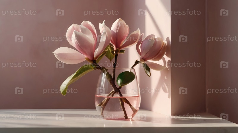 Элегантная магнолия цветет на ветке в стеклянной вазе на розовом фоне с контрастным солнечным светом. Нежные цветы с розовыми оттенками. Деревенская ветвь