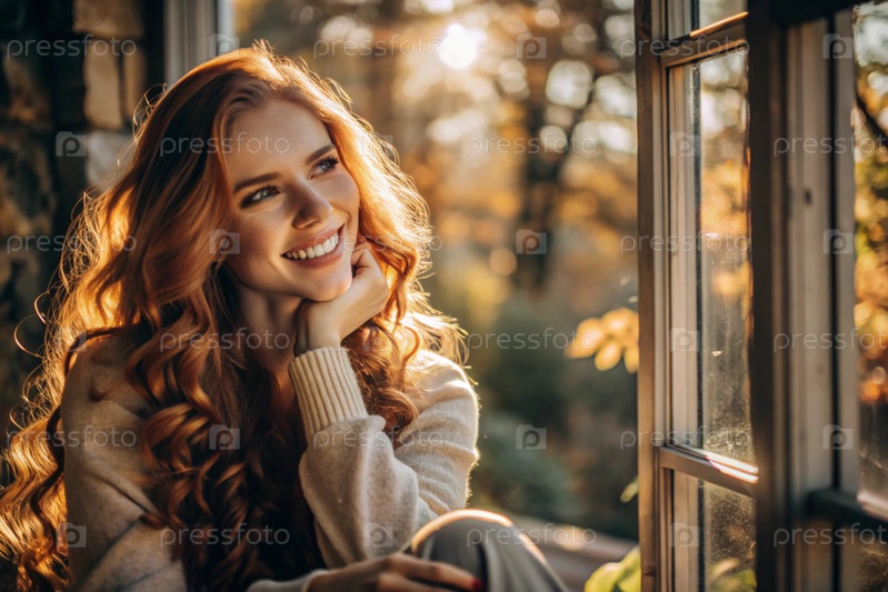Портрет красивой улыбающейся рыжеволосой девушки с вьющимися волосами у окна, где светит теплое осеннее солнце. Это осень за окном