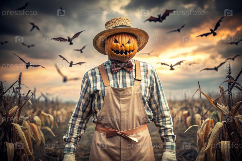 Концепция праздника Хэллоуин. Ужас. Страх. Страшный пугал с тыквой для головы, в клетчатой рубашке и галстуке-бабочку. Баннер, открытка