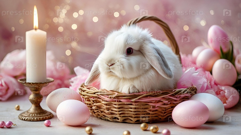 Концепция яркого пасхального праздника. Нежные пасхальные яйца, кролик и нежные цветы на пастельном акварельном фоне с нежными венами