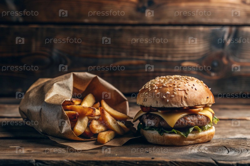 Картофель фри, гамбургер, свиные ребра на стильной доске на деревянном фоне. Жареный картофель. Концепция фаст-фуда, нездоровой пищи и приготовления фаст-фуда