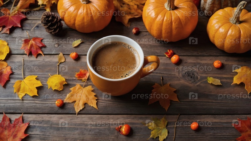 Вкусный тыквенный латте в кружке, тыквах и осенних листьях на деревянном столе. Сезонные напитки. Вкусный горячий капучино. Осенний баннер