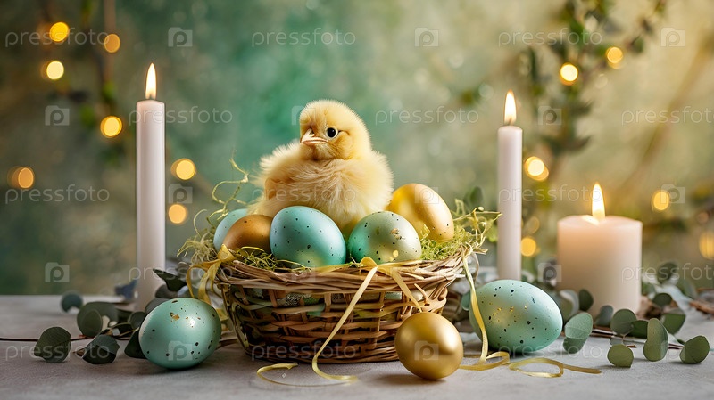 Концепция яркого пасхального праздника. Нежные пасхальные яйца в корзине и желтые куры и зеленые ветви эвкалипта на пастельном акварельном фоне с нежными венами