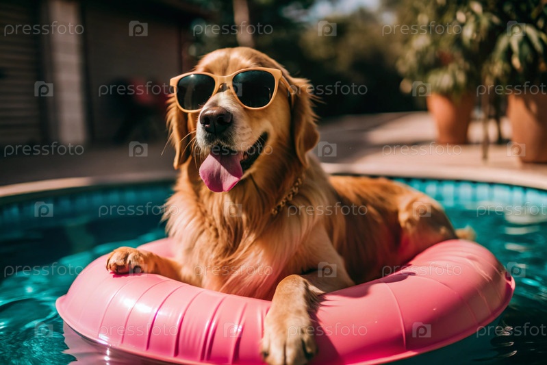 Близко. Счастливый золотой ретривер в розовых очках на розовом надувном кольце плавает в бассейне. Концепция дружественных отпусков для домашних животных