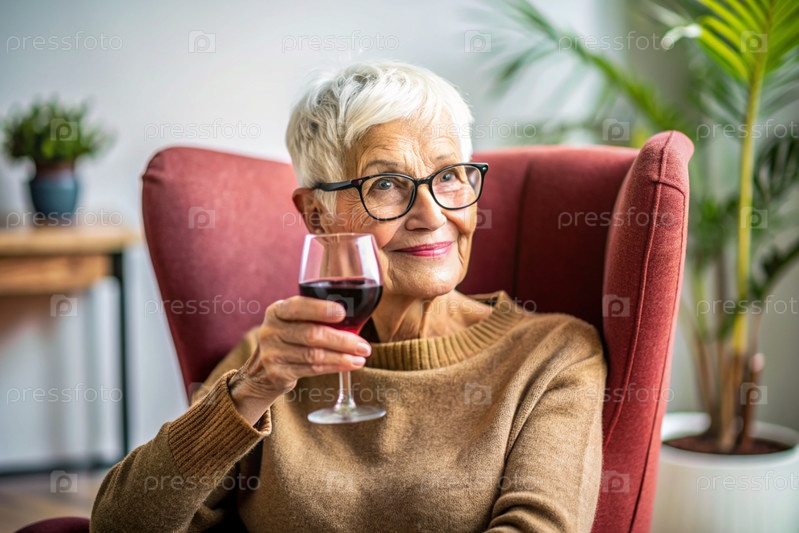 Близко. Современная, стильная, пожилая женщина с короткими волосами со стаканом красного вина в кресле в гостиной дома