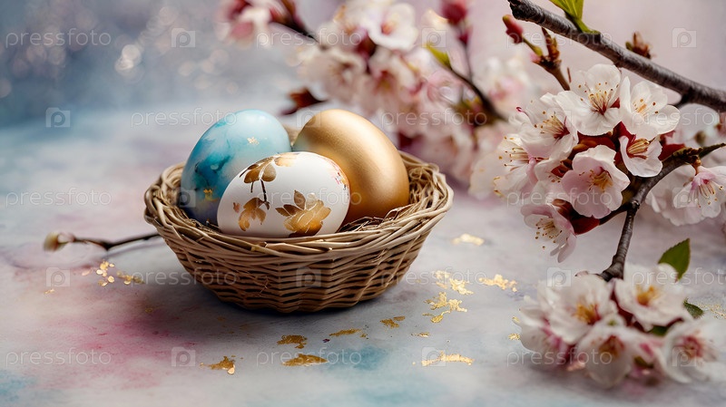 Концепция яркого пасхального праздника. Нежные пасхальные яйца и вишневые ветви цветут на пастельном акварельном фоне с нежными прожилками