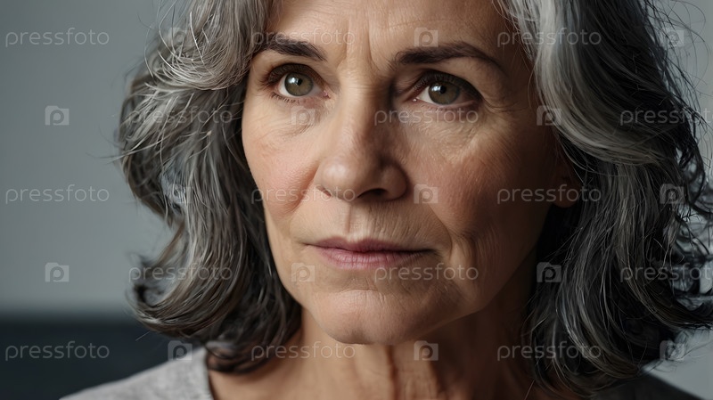 Минимализм. Студийный портрет естественно стареющей элегантной седой пожилой женщины в интерьере и одежде спокойных тонов. Концепция пожилых людей