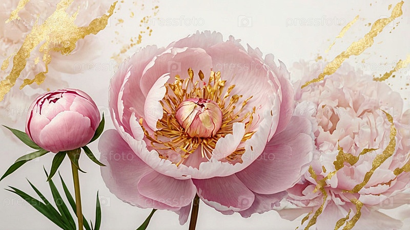 Пионы — это летние ароматные цветы. Красивый цветочный фон с красивым эффектом боке. Нежные розовые почки пиона на белом акварельном фоне с золотыми жилками