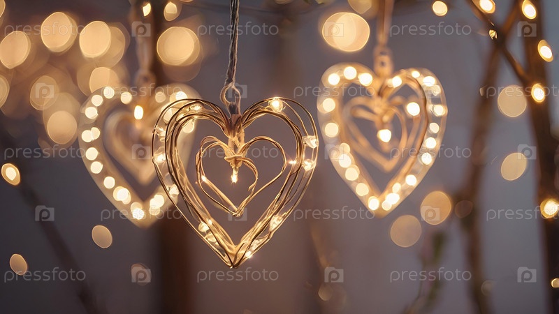 Концепция Дня святого Валентина, баннер с гирляндами в виде сердец и волшебных огней для праздника, наполненного любовью. Место для текста
