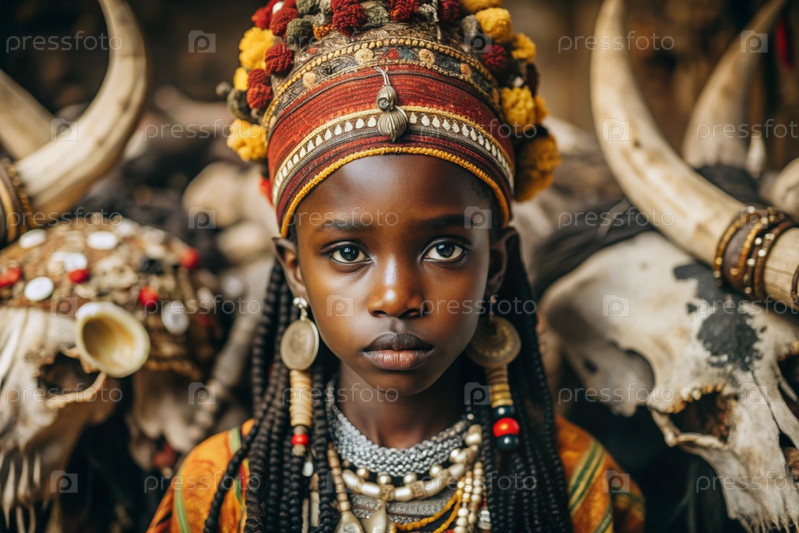 Красивая африканская девушка в традиционном африканском национальном костюме. На фоне костей. Портрет символизирует традиции, культуру и красоту африканского народа