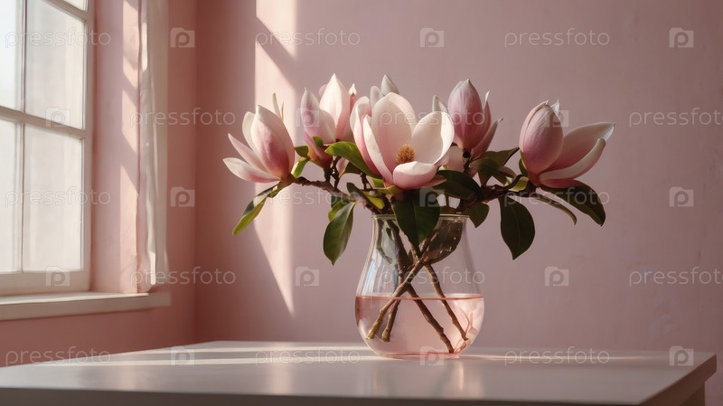 Элегантная магнолия цветет на ветке в стеклянной вазе на розовом фоне с контрастным солнечным светом. Нежные цветы с розовыми оттенками. Деревенская ветвь